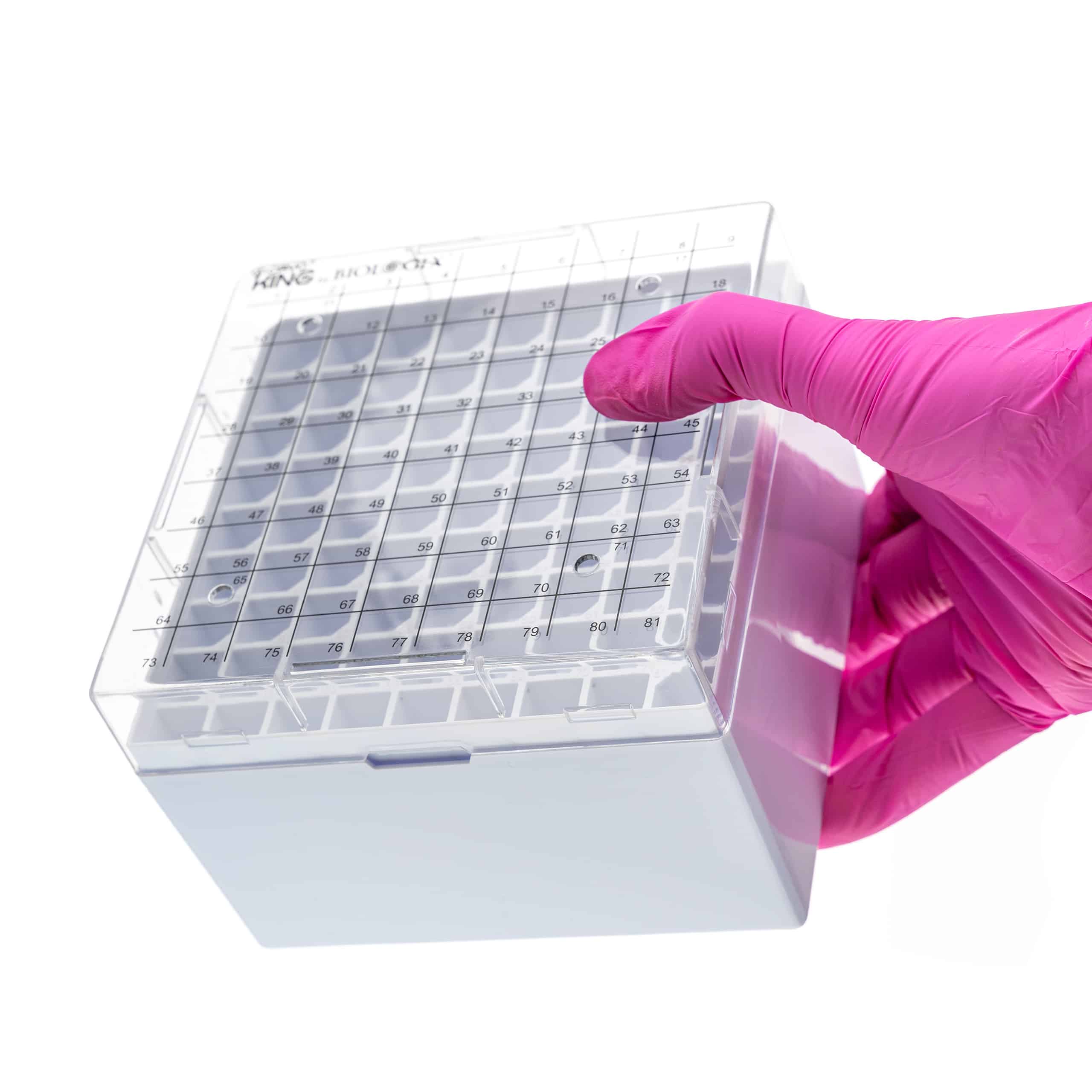 Kriopudełko Biologix® CryoKING wykonane z odpornego na ekstremalne temperatury poliwęglanu (PC), przeznaczone do przechowywania i głębokiego mrożenia probówek o pojemności 0,5 ml, 1,5 ml, 2 ml oraz 5 ml i średnicy do 12,5 mm. Trzyczęściowa konstrukcja zawiera kolorową wkładkę wewnętrzną, która ułatwia segregację próbek, oraz przezroczystą pokrywkę z podziałką 9 × 9.