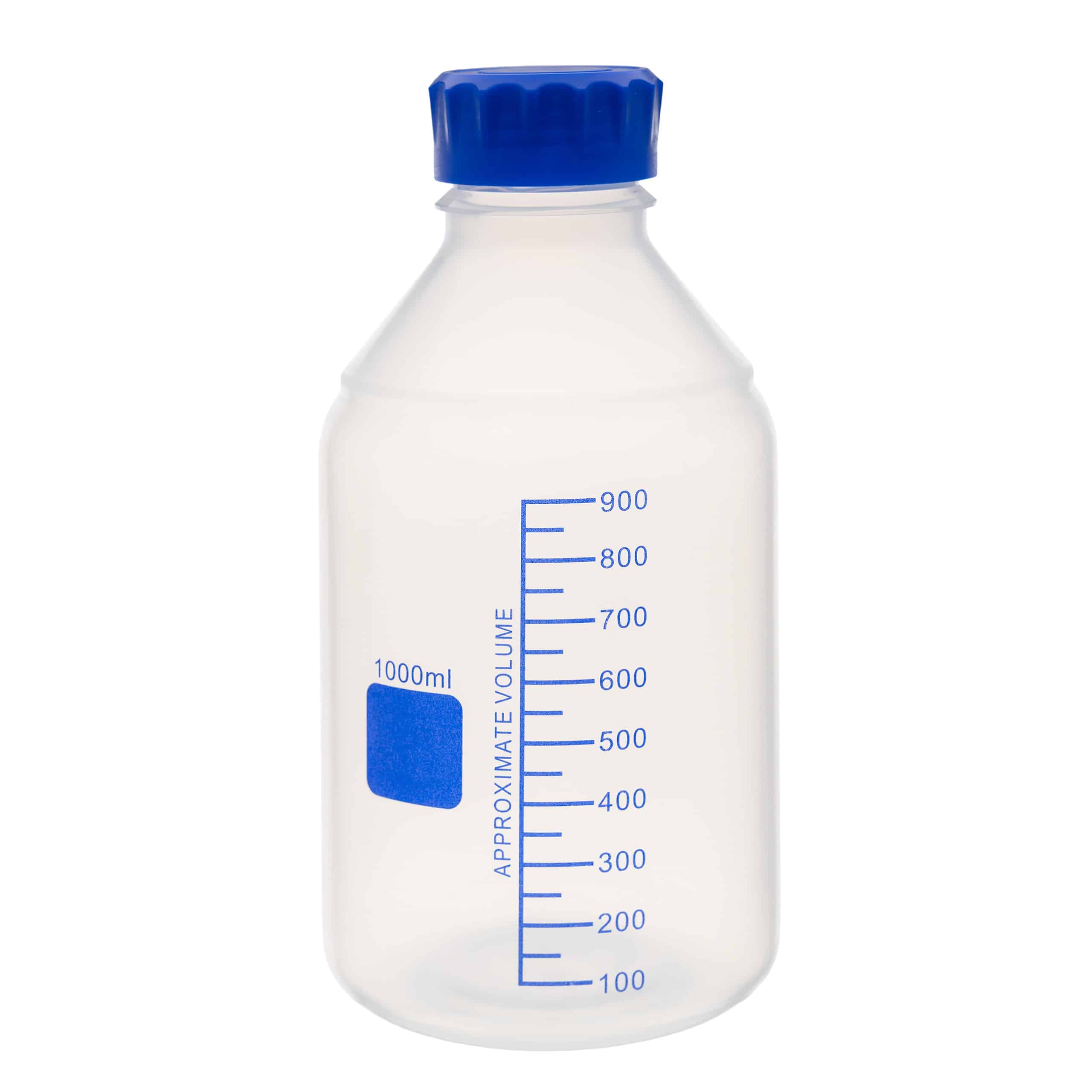Butelki laboratoryjne wykonane z polipropylenu (PP) w dwóch wariantach: półprzezroczystym (bezbarwnym) z niebieską skalą oraz brązowym z czarną skalą. Wyposażone w niebieską nakrętkę GL45, umożliwiającą szczelne zamknięcie i autoklawowanie do 121 °C. Szeroki wlew ułatwia napełnianie proszkami, pastami lub cząstkami. Dostępne w pojemnościach: 100 ml, 250 ml, 500 ml, 1000 ml i 2000 ml.